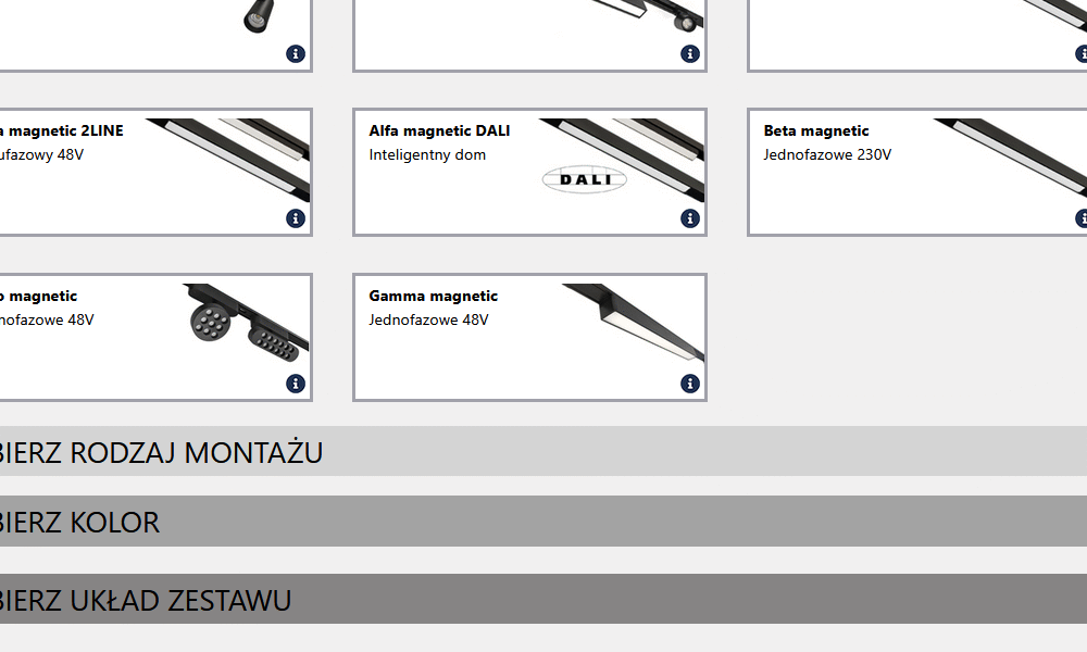 użytkownik wybiera interesującą go linię szynoprzewodów, określa ich kolor (biały lub czarny), a następnie dobiera odpowiednią długość szyn, łączniki, zaślepki czy reflektory LED. Konfigurator prowadzi przez proces krok po kroku, prezentując kompatybilne elementy, co całkowicie eliminuje ryzyko zakupu niepasujących części.