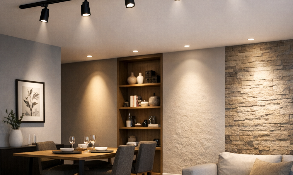 Dobrą praktyką jest mieszanie funkcji, a nie przypadkowe mieszanie opraw. Nad stołem możesz użyć zwisu jako światła głównego i uzupełnić go reflektorami 24° lub 36° na tło. W salonie obraz lub regał może dostać 15° albo 24°, a miękkie dopełnienie narożnika zapewni 60°. Dzięki temu wnętrze nie jest płaskie i nie opiera się na jednej, monotonnej warstwie światła.